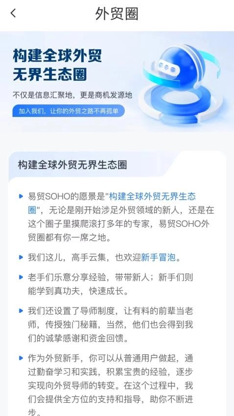 易贸soho最新版是一款面向外贸从业者的智能助手软件,整合了全球买家线索资源,用户可按需在线对接客户,助力构建无边界的全球外贸生态圈,高效挖掘所需线索以优化询盘策略、把握商业机遇。平台支持个性化定制功能,能对热门询盘商机进行筛选,提升询盘效率与工作效能,还可查看询盘线索的详细信息。另外,易贸soho手机版具备数据统计分析能力,帮助用户洞察市场趋势、掌握每日更新数据,有需求的用户欢迎前往本站体验使用!