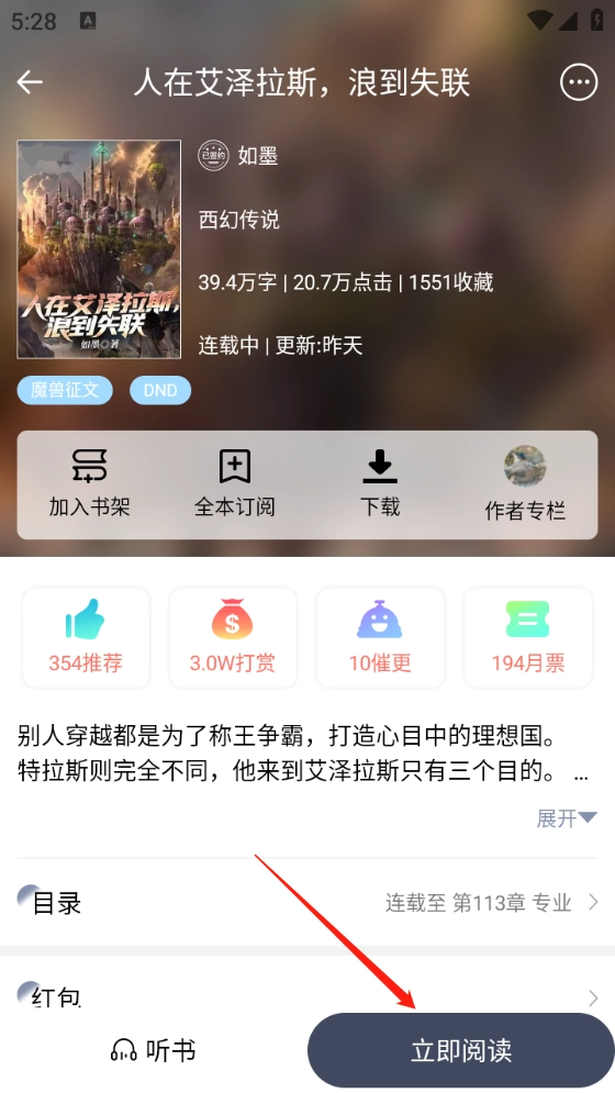 4、找到心仪的小说后点击进入,再点击“立即阅读”按钮,就能开始阅读了。
