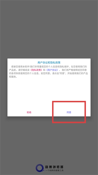 1、在阅读《隐私政策》和《用户协议》后,点击【同意】按钮,以此确认接受协议并使用该浏览器服务。