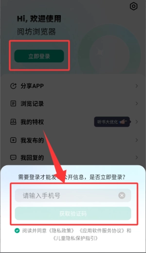 2、在这个界面上点击“立即登录”按钮,随后输入手机号码和验证码,以此完成登录操作。