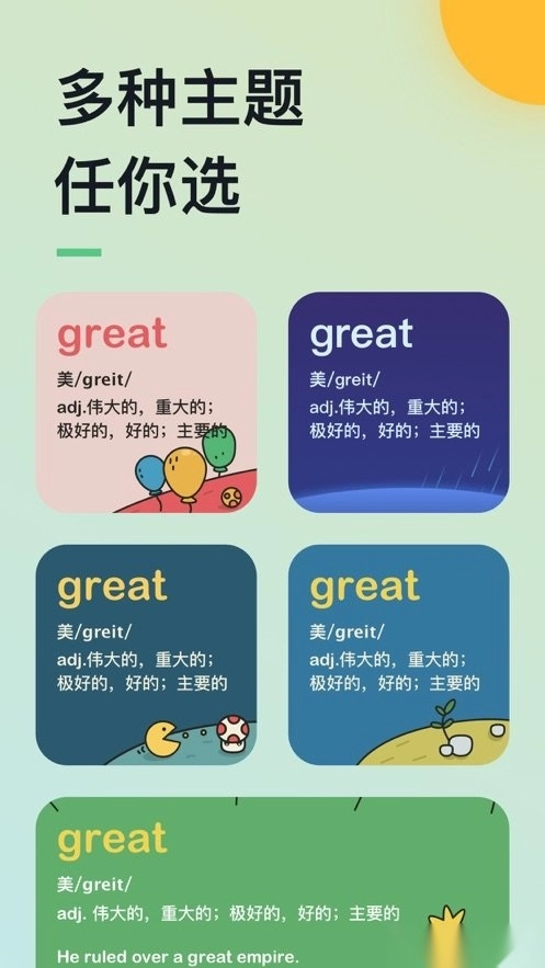 这里有多种主题可供你挑选,界面设计优雅大方,操作方式简洁明了,还有为你量身定制的记忆规划以及高效的抗遗忘策略,能帮助你真正掌握那些学习过的英语单词。