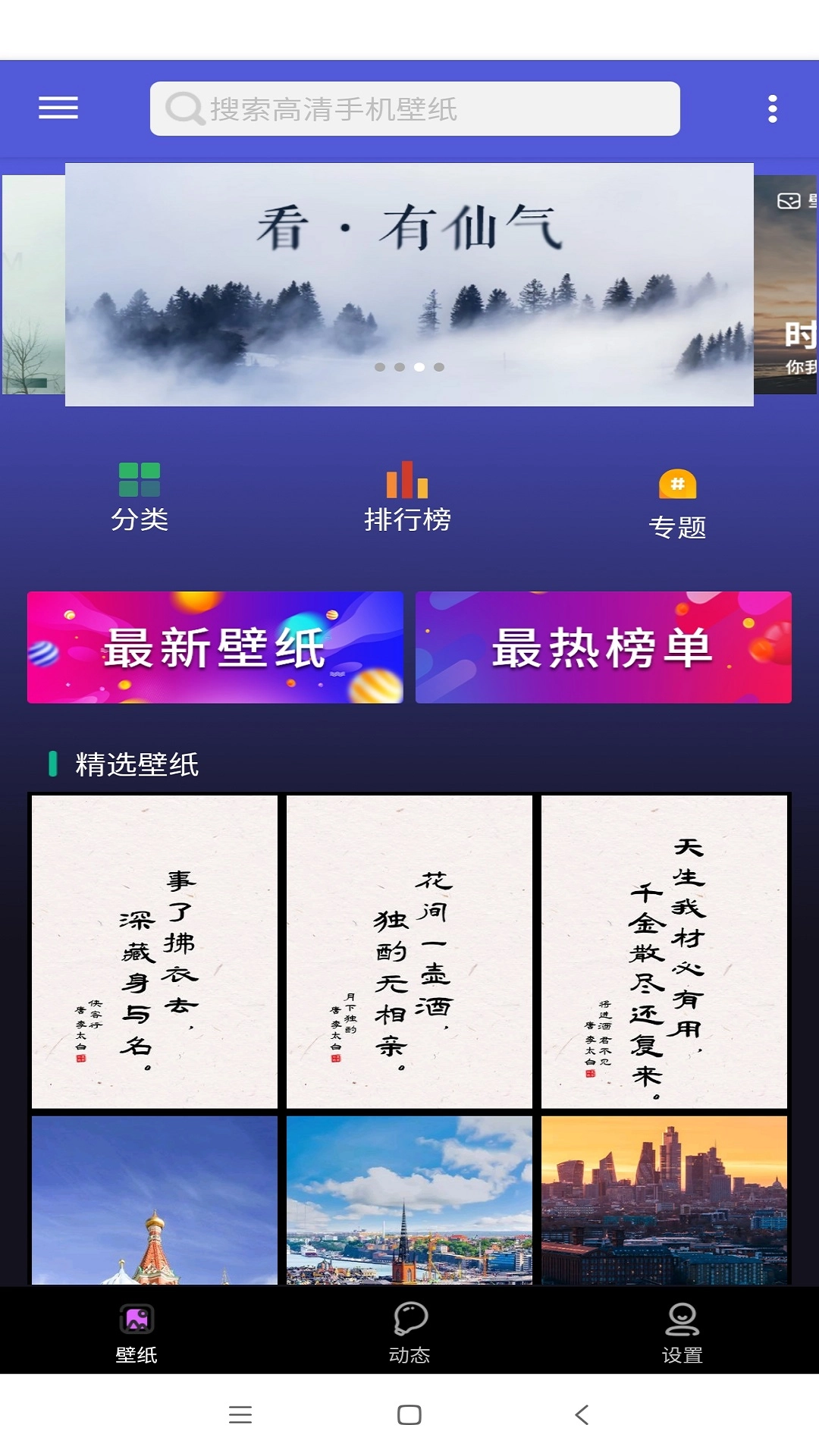 动态壁纸秀场手机版是一款免费的动态壁纸应用,支持一键搜索高清手机壁纸,分类细致全面,涵盖壁纸排行榜、专题、精选等板块,古风、夜景、高清、动漫、爱情、风景、软件、二次元、美女、摄影等各类壁纸应有尽有,网罗海量高清及动态精品壁纸。