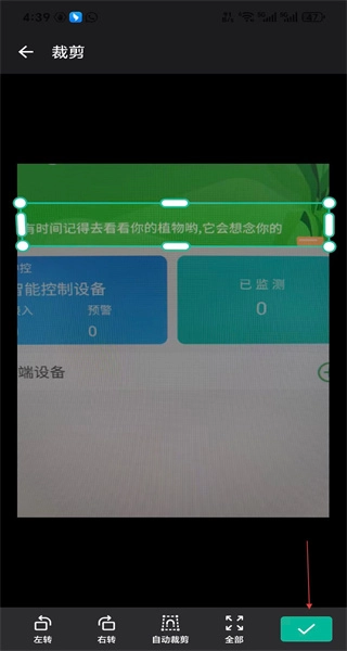 2、进入裁剪界面,调整截图的裁剪区域,确认无误后点击底部的对勾按钮,即可进入后续的处理环节。