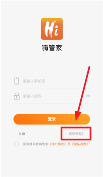 在本站安装并打开嗨管家应用,进入登录页面后,点击“忘记密码”选项。