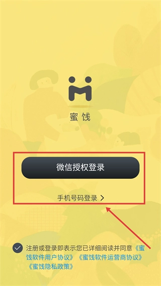 1、在“蜜饯”应用的登录页面,选择点击【微信授权登录】或【手机号码登录】选项完成登录操作。