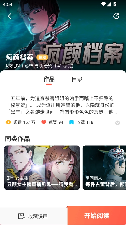 2、详情界面可以看到作品介绍和目录,点击开始阅读