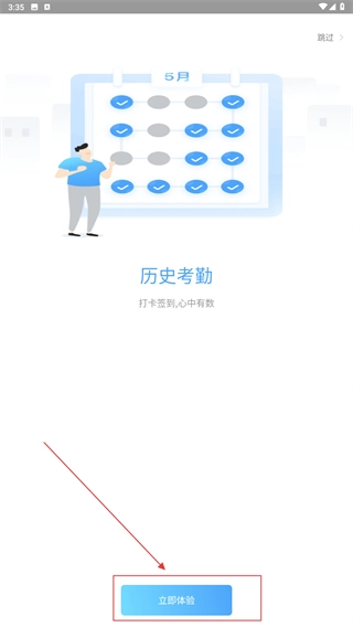 2、在历史考勤页面,点击【立即体验】按钮,进入考勤功能模块,查看或管理考勤相关信息。