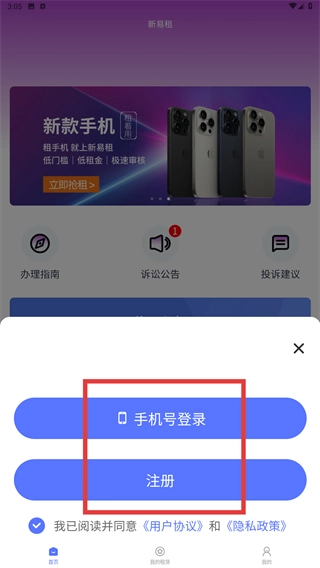 3、点击【信用租机】后,会弹出登录注册相关选项,你可以选择【手机号登录】或者【注册】,与此同时需要勾选相关协议以完成确认操作。