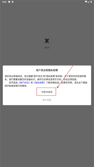 1、启动【新易租】应用,仔细阅读《用户协议》和《隐私政策》后,点击【同意并接受】按钮,即可进入应用的主界面。