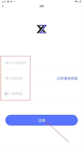 4、进入注册界面后,先输入【手机号码】,接着获取并填写【验证码】,若有【推荐码】可选择填写,最后点击【注册】按钮,即可完成账号创建。