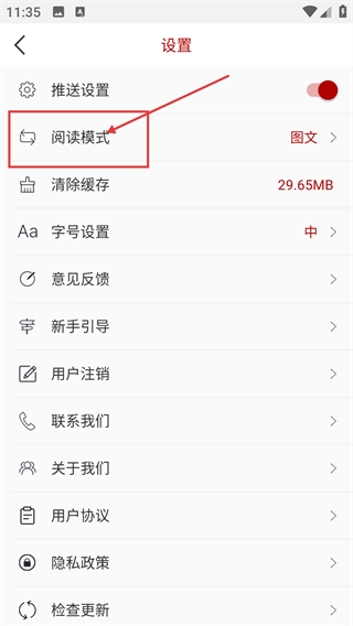 3、进入设置页面后,找到【阅读模式】选项并点击,该选项当前显示为【图文】,点击后会弹出阅读模式的选择弹窗。