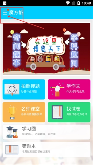 1、点击左上角的【魔方格】菜单按钮,展开功能栏后,主界面会呈现【拍照搜题】【学作文】【名师课堂】等学习辅助类功能。