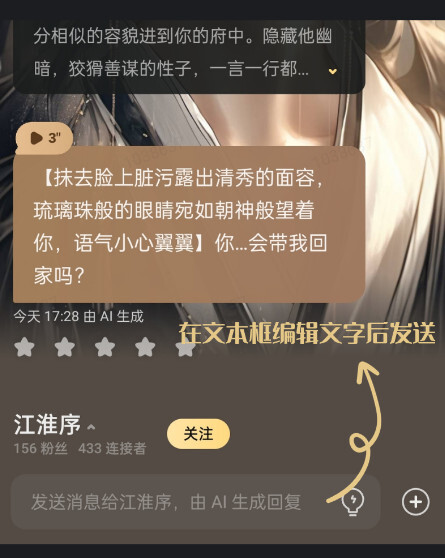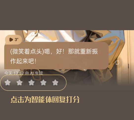 2、进阶对话:让TA更接近你想要的样子01 评价TA的回复根据你的体验来给智能体的最近一条回复打上小星星,系统将会根据打分结果来调整TA的聊天方式。