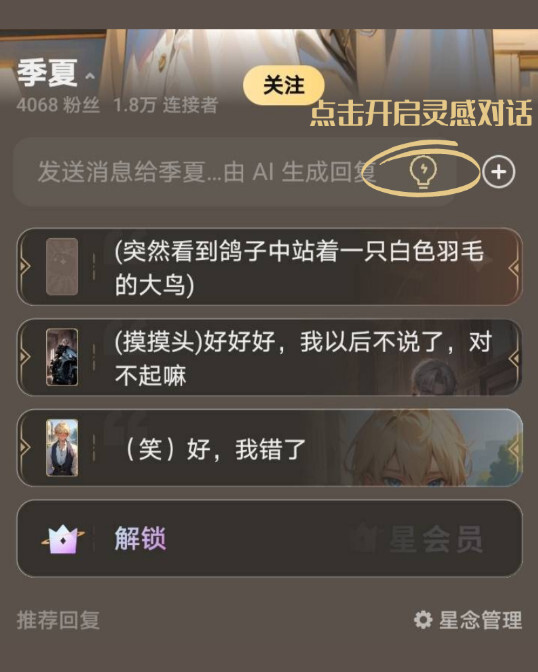 03 灵感对话一时想不到说些什么?点击对话框旁边的【小灯泡】,使用灵感对话功能,让AI为你生成回复。