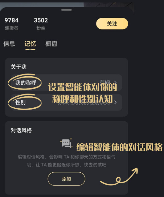02 调整TA的认知点击左下角智能体的名称,可以在【记忆】栏中设置TA对你的称呼和性别认知。如果对智能体目前聊天的方式和语气不满意,还可以在【记忆】栏中编辑智能体的对话风格。如果想要修改至今为止的剧情或者对话,可以使用重说、回溯、重启功能。