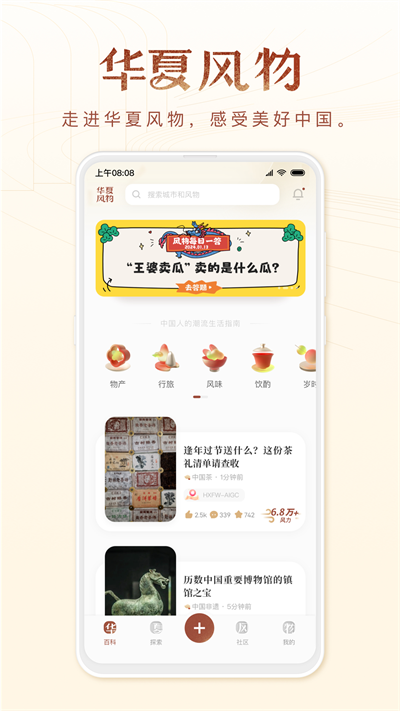 华夏风物App是一款聚焦于探寻与分享中国各地特色风物的互动平台,它对中国物产、文旅资源、文博遗产、非遗文化等风物内容进行结构化梳理和数字化保存,以此促进风物内容的建设以及消费信息、文化信息的顺畅流通,助力更多人领略文化的根源与生活的美好。