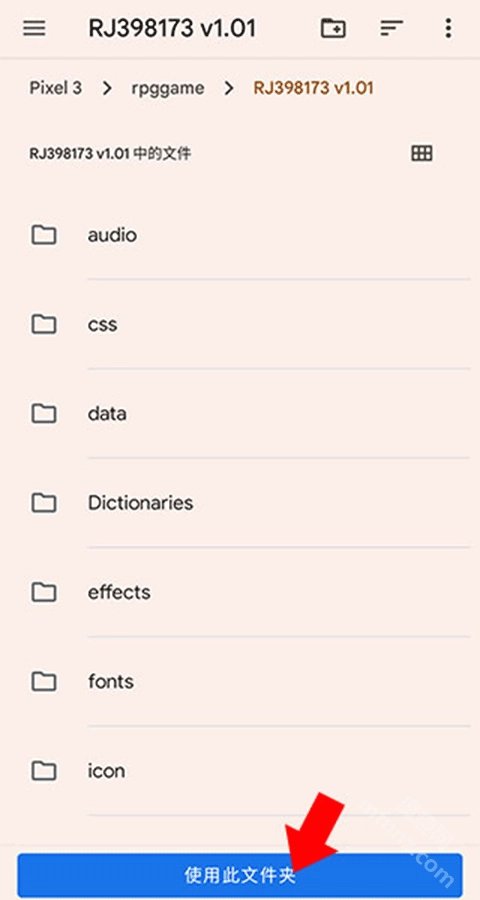 3、找到我们刚刚解压好的游戏文件夹,然后点击下方的“使用本目录文件”按钮(要是游戏并非由RPG Maker MV制作,系统会弹出提示说明无法运行该游戏)
