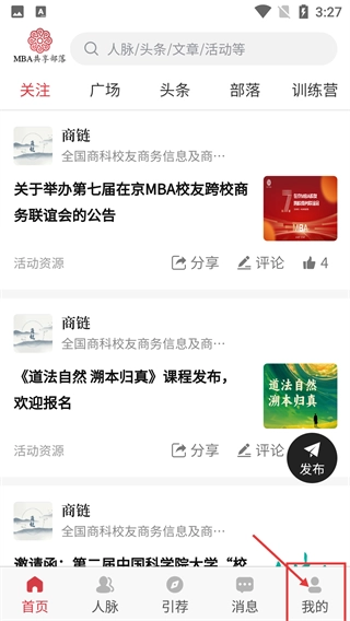 2、主界面设有【关注】【广场】等板块,在这里能浏览商务活动、课程等各类信息,点击底部的【我的】选项,即可进入个人相关的操作页面。