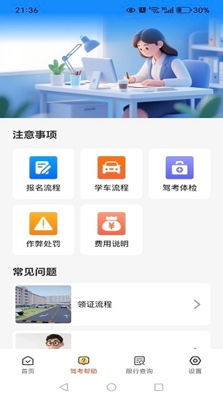 4、进入驾考帮助页面,能够了解驾考报名的具体流程,也可以掌握学车的相关流程。