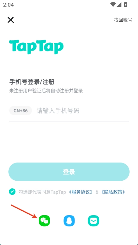 2. 在登录界面勾选服务协议,接着点击微信图标,之后按照提示完成登录操作即可。