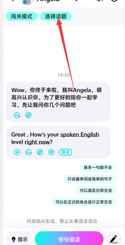 第二步:挑选你平时乐于用来聊天互动的话题,与AI机器人进行聊天互动。