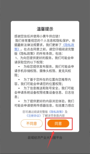 1、在小黄牛供应链里点击“同意”温馨提示,即可进入引导页面。