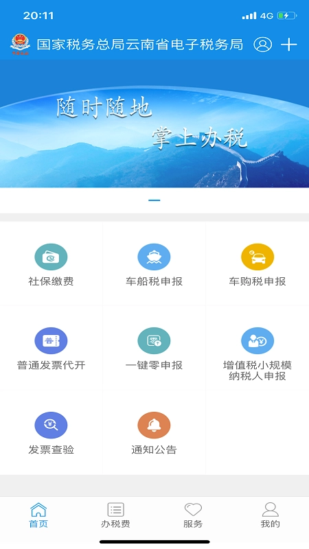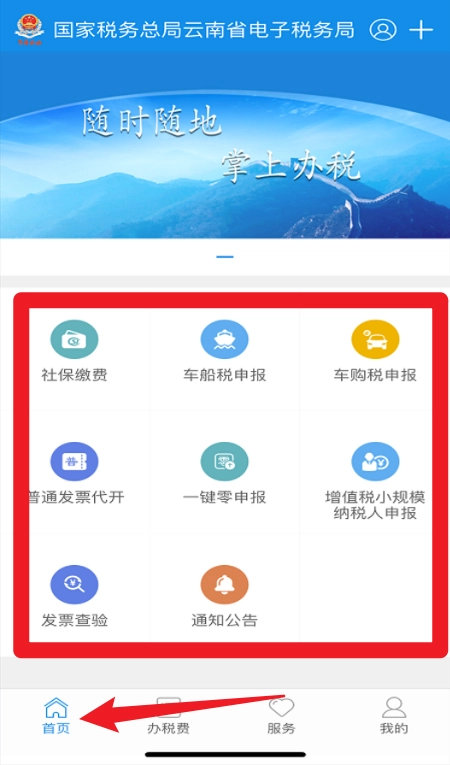 1、进入首页后,能够快捷办理社保缴费、车船税申报、车购税申报、发票查验等常用业务。