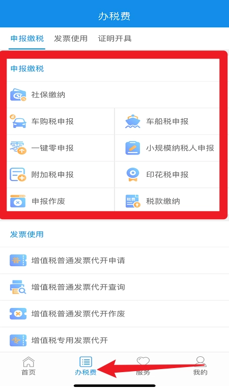 2、点击办税费,可进行社保缴纳、车购税申报、附加税申报、申报作废等全流程操作。