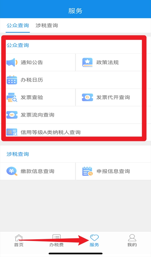 3、服务板块支持公告通知、政策法规的查看,以及发票流向和信用等级的查询功能。