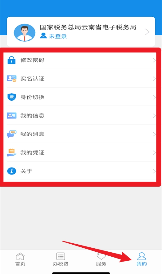 4、进入“我的”页面,可进行实名认证、修改密码、切换身份,还能查看我的凭证和消息。