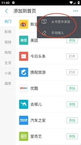 3、当然,你也可以点击右上角的三个点按钮,直接手动输入添加内容,或者从书签里选择添加。