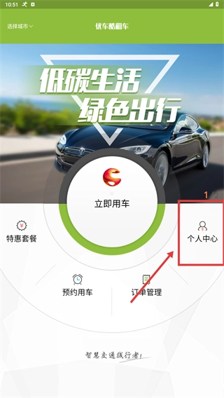 1、打开优车酷租车应用,在首页找到并点击【个人中心】选项,即可进入个人中心页面。