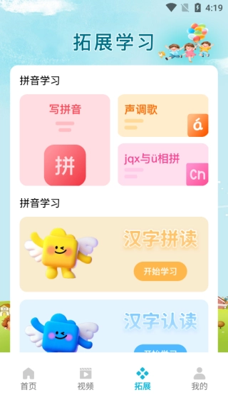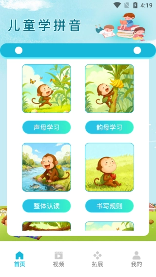 首页推送了丰富的拼音教学资源,还能开启多种学习模式。