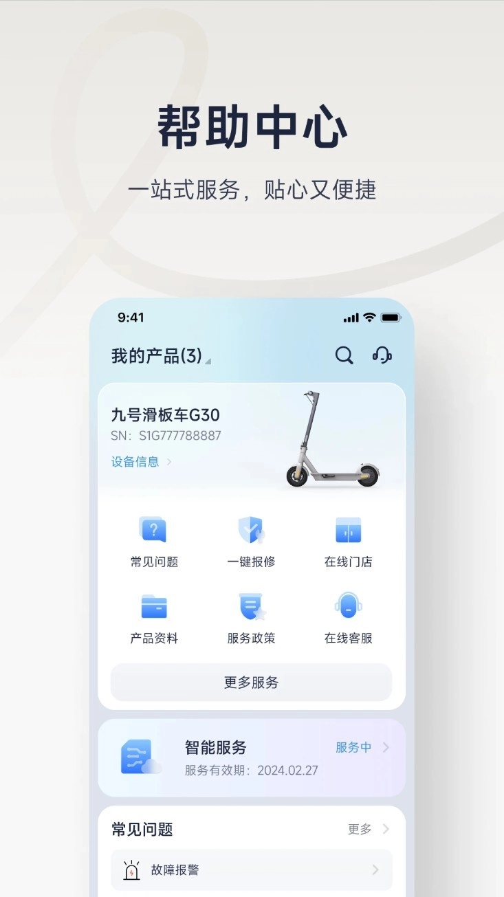 1、智能设备管控:可借助蓝牙或远程途径对九号系列设备进行操控,完成解锁、锁车、启动、设防等一键式管理操作。