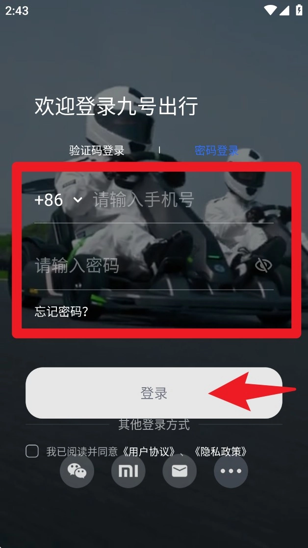 1. 进入App后,首先需要完成登录操作:输入手机号和密码,点击页面下方的登录按钮以完成身份验证;若有需要,也可选择其他方式登录账户。