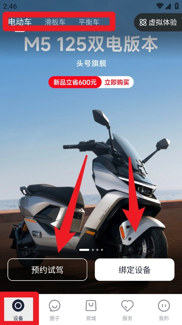 2. 登录成功后会自动跳转至设备页面,在这里可以选择电动车等产品类别,通过点击绑定设备或预约试驾来进行设备管理操作。