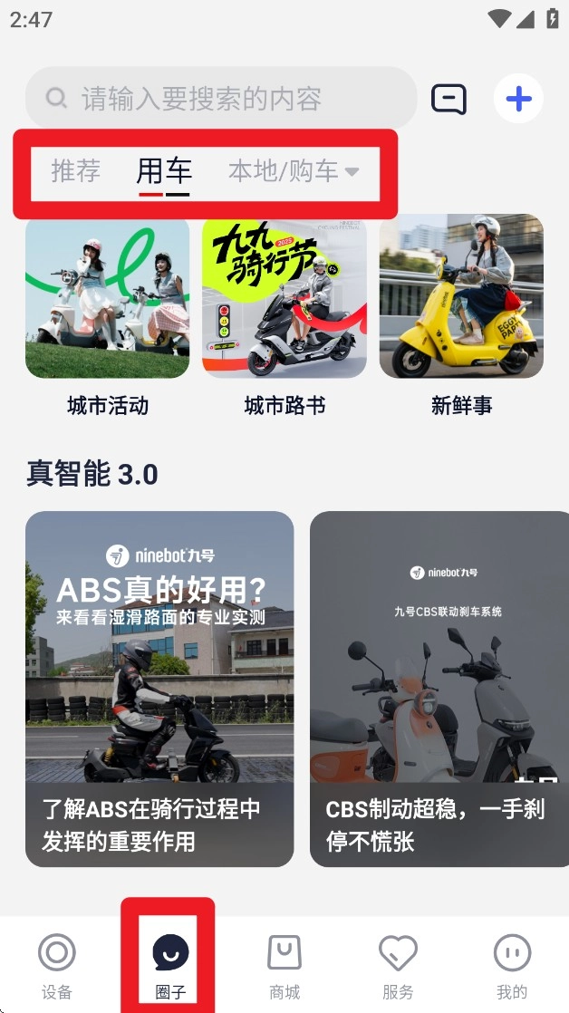 3. 点击底部的圈子标签页,即可浏览骑行相关资讯和热门活动;若切换用车分类,则能查看骑行测评以及推荐内容。