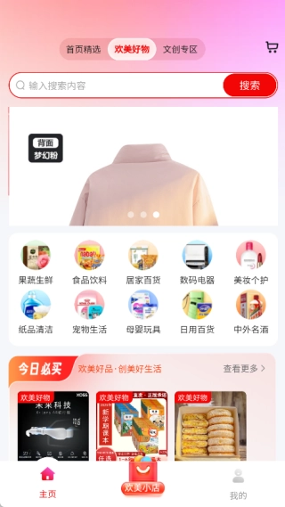 2、欢美好物页面涵盖了果蔬生鲜、食品饮料、居家百货、数码电器、美妆个护等多个类别。