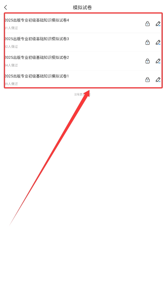 4、页面下拉至底部出现“没有更多”提示即表示所有可用试卷已加载完毕,接下来只需选择一份试卷开始全力冲刺吧。