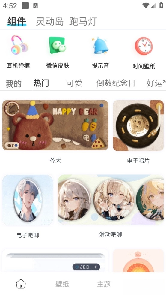 《万能主题组件》是一款趣味十足的手机桌面美化应用,桌面组件、主题壁纸、充电动画、微信皮肤等丰富功能,能让你的手机桌面焕然一新,无论你偏爱哪种风格,都能在这里找到心仪之选,全方位满足你的美化需求;而且软件操作简便,只需挑选喜欢的小组件点击保存,就能直接在桌面使用。