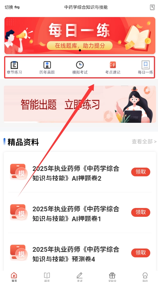 3、要是想领取备考资料呢,可以向下滑动到精品资料区,找到最新的模拟押题卷,点击领取就行啦。