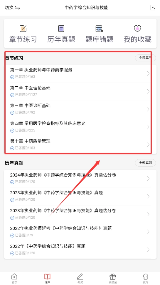 进入软件后,先找到顶部的科目切换功能,选择你要学习的科目(例如中药学综合知识与技能),就能开始学习了。