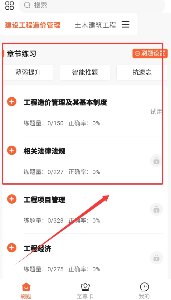 3、挑选一个具体的章节开始练习吧,每道题完成作答后,系统会自动统计并记录你的练题数量与正确率等相关数据。