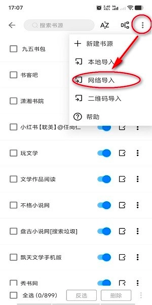 进入“书源管理”界面后,就可以看到的书源;点击右上角的三个点,并选择“网络导入”;
