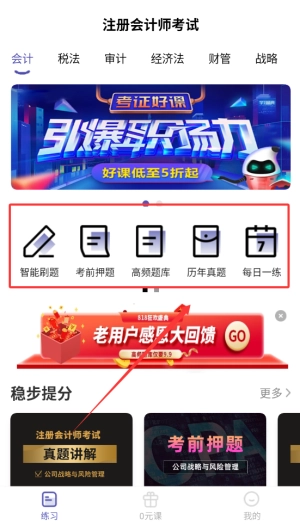 1、章节精练模块按最新教材目录细分知识点,每个小节提供基础、进阶、冲刺三级题库,用户可根据当前。