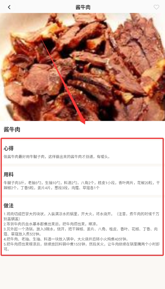 2、找到喜欢的菜谱比如酱牛肉,记得先看好用料和心得,跟着详细步骤做成功率更高哦。