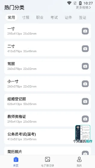 种类多样:可免费制作多种证件照,涵盖一寸照、二寸照、学生证件照等不同规格,能满足工作与生活里对证件照格式的各类需求。