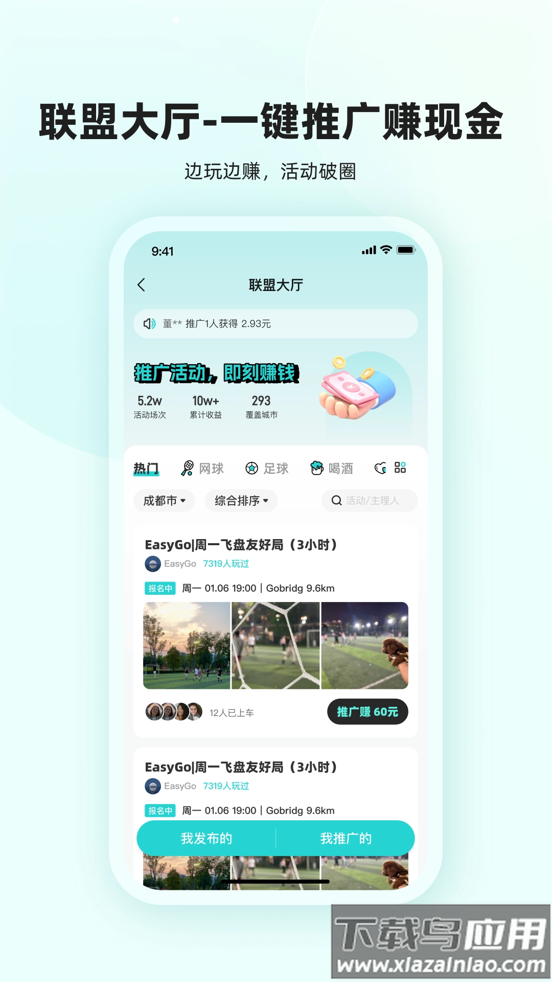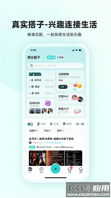 1. 热门活动推荐:首页会实时更新同城的热门活动,用户能够直接报名参加自己感兴趣的项目;