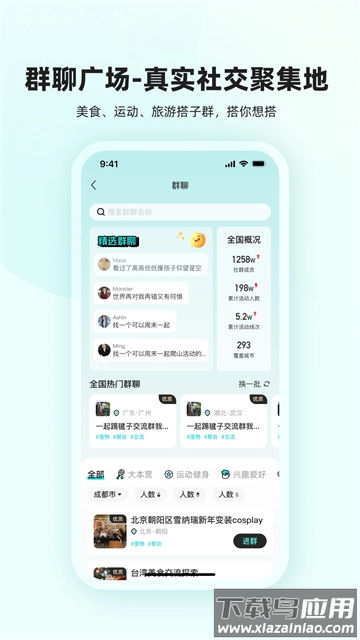 4. 群聊互动空间:设有多元兴趣群组,便于用户参与讨论或发起活动邀约;