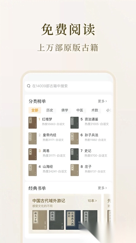 中华典籍浩如烟海,承载着千年智慧结晶。如今借助数字技术,这些珍贵文献得以跨越时空与当代读者相遇。北京抖音信息服务有限公司开发的古籍阅读平台,将上万部珍稀典籍搬上移动端,让用户随时领略传统文化的深厚魅力。平台不仅呈现原版古籍真迹,还提供专业译文和注释功能,让晦涩的文言文变得通俗易懂;其精心设计的分类系统和热门榜单,能帮助用户快速找到心仪的典籍内容。喜爱传统文化的朋友不妨一试。
